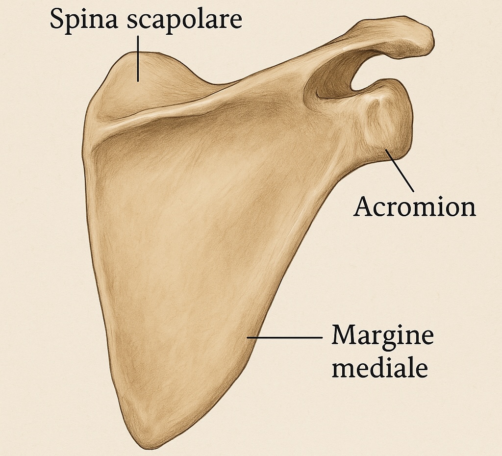 Le scapole sono due ossa pari di forma triangolare situate sulla parte dorsale superiore del torace, all’incirca tra la seconda e la settima costa. Ciascuna scapola (nota in termini colloquiali come omoplata o osso della spalla) ha una struttura sottile e piatta che le permette di aderire alla gabbia toracica. Presentano una faccia anteriore (rivolta verso le costole) e una faccia posteriore (palpabile sotto la pelle della schiena). Sulla faccia posteriore di ogni scapola si trova una prominenza ossea chiamata spina scapolare, che divide la superficie in due aree: una superiore (fossa sovraspinata) e una inferiore (fossa sottospinata). L’estremità laterale della spina forma l’acromion, una sorta di proiezione a forma di uncino che si articola con la clavicola a formare l’articolazione acromion-clavicolare. Sempre sull’angolo laterale della scapola è presente la cavità glenoidea, una superficie concava dove si inserisce la testa dell’omero: insieme formano l’articolazione scapolo-omerale, ovvero l’articolazione della spalla. Un altro elemento importante è il processo coracoideo, una sporgenza ossea a forma di becco situata anch’essa sul margine superiore laterale, punto di attacco per vari legamenti e muscoli.