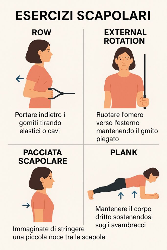 Mantenere forti e flessibili i muscoli che controllano le scapole è fondamentale per una schiena sana e per prevenire dolori. Ecco alcuni esercizi consigliati per allenare le scapole e migliorare la postura (eseguibili a corpo libero o con attrezzi semplici):